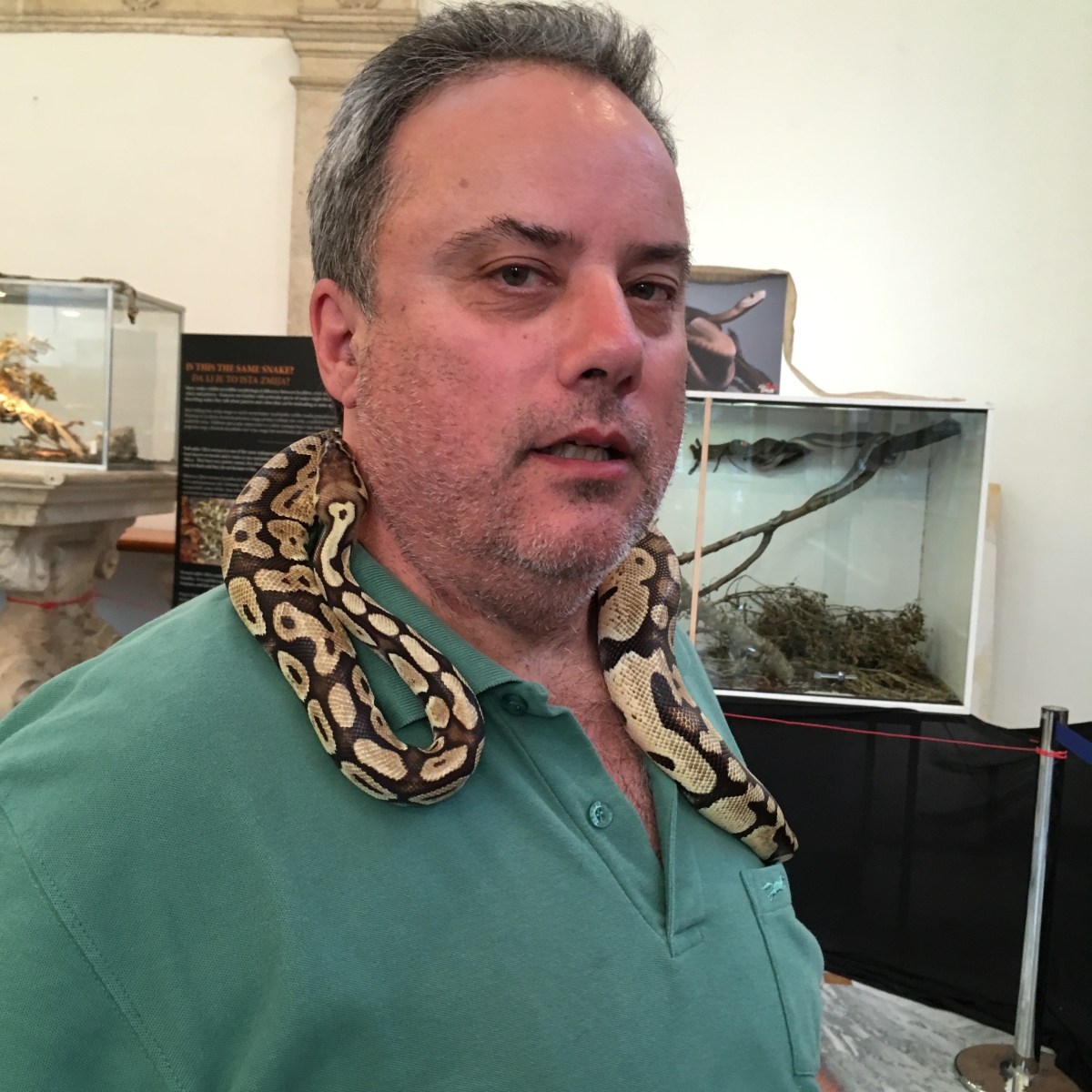Wouldn't you know it, my husband says oh look they're letting us hold snakes, I'm doing it. Ok, I'll just take pictures. The snake seems very calm as she snakes up his shoulder and round his neck. Then it gets draped over his shoulders and it starts to nibble at his ear. I get goose flesh just looking at it.